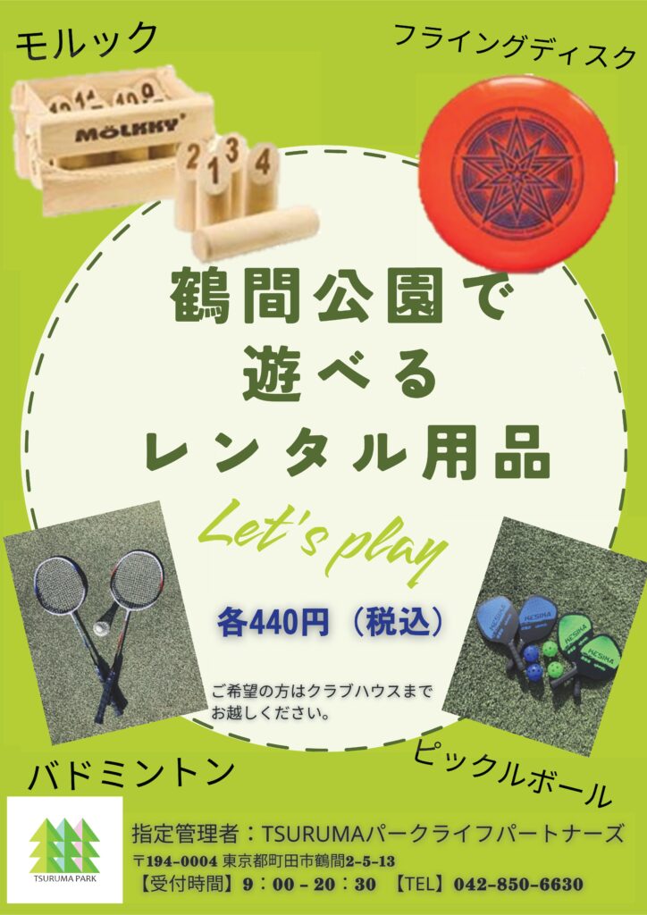鶴間公園では、公園利用の皆様にレンタル品のサービスを実施しております。