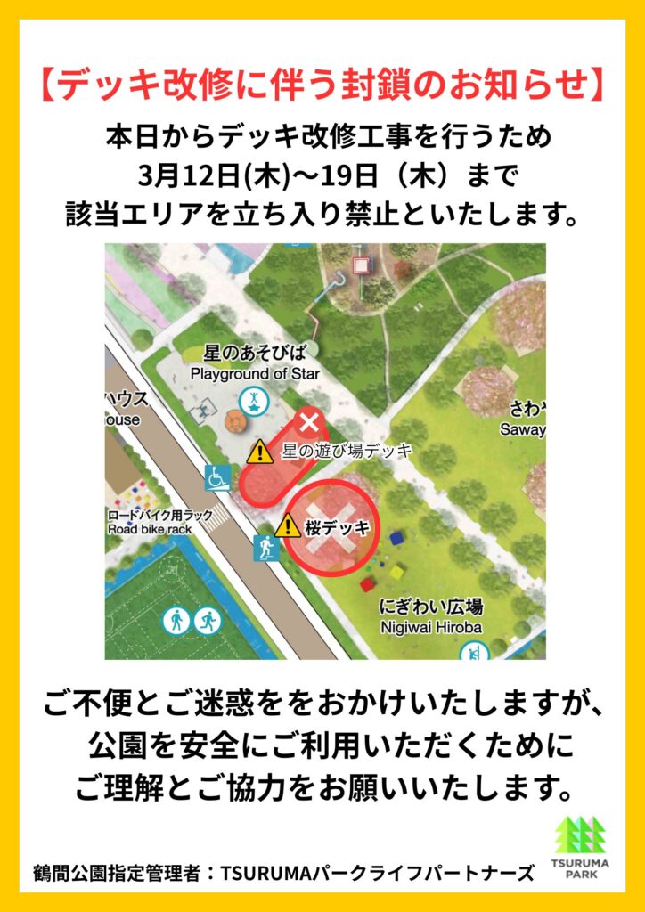 2026.03.12 インフォメーションブログ デッキ改修に伴う封鎖のお知らせ デッキ改修工事を行うため3月12日(木)~19日(木)まで該当エリアを封鎖いたします。ご不便とご迷惑をおかけいたしますが、ご理解とご協力をお願いいたします。